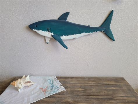 Carved wall sharks vary from realistic to abstract interpretations. Minimalist designs emphasize silhouette, line, and balance. Multi-layered wood creates depth and visual interest. Color-treated or stained pieces integrate with interior color schemes. Large statement pieces act as focal walls. Smaller versions complement gallery walls or shelves. Wood shark wall decor pairs well with nautical accents. Placement near water-themed rooms enhances ambiance. Lighting highlights detail, shadow, and texture. Combining sizes and finishes achieves dynamic displays.
